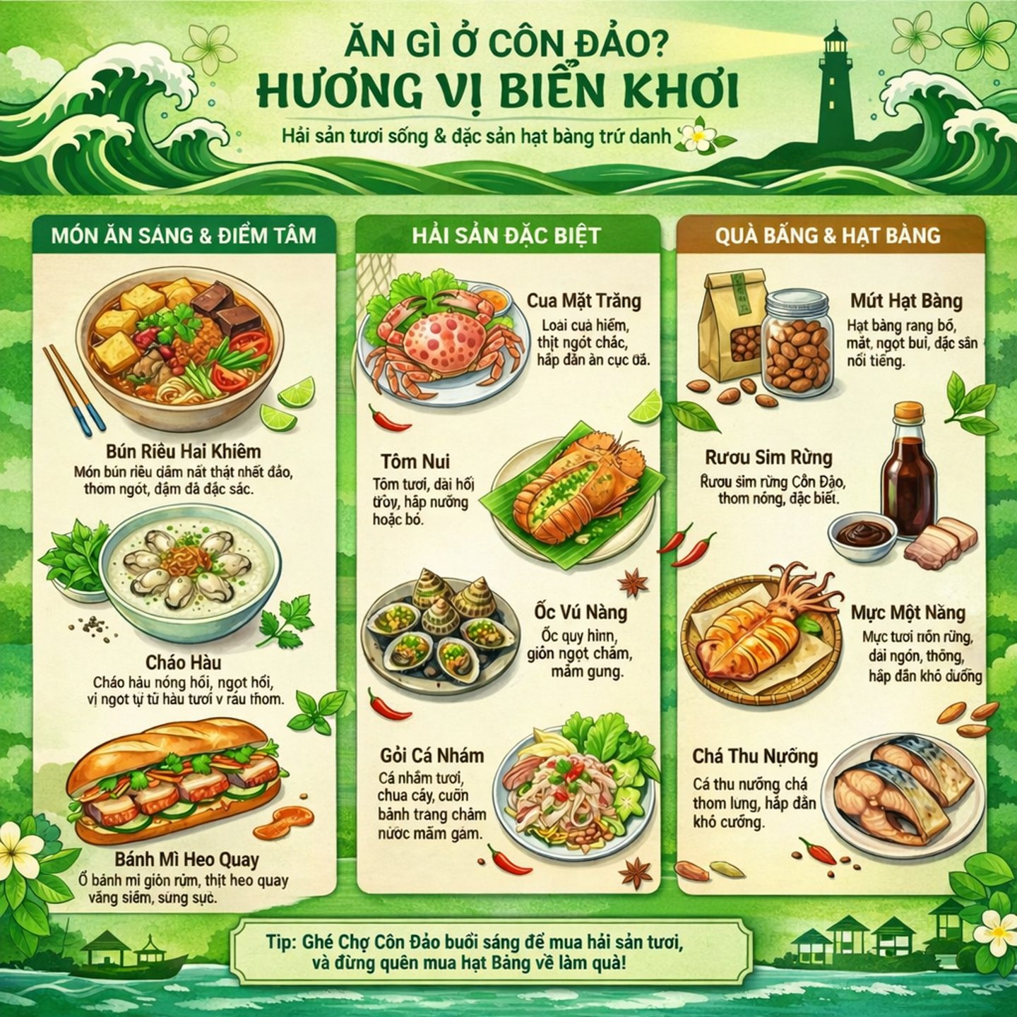 📍 Côn Đảo nổi tiếng với nguồn hải sản tươi ngon, trong đó bạn nhất định nên thử các món như ốc vú nàng, ốc nón, ốc tai tượng, ốc bàn tay, tôm hùm đỏ, tôm mũ ni, cá mú đỏ và mực một nắng. Hải sản ở đây được đánh bắt trong ngày nên giữ được độ ngọt tự nhiên, chế biến đơn giản vẫn rất đậm đà. 🦞🐚